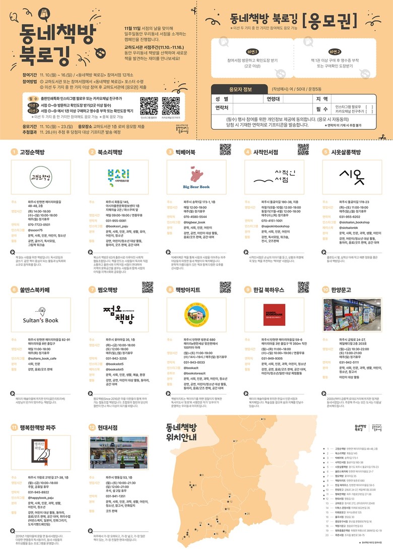 이재면 교하도서관장은 “2025년 서점의 날을 맞아 준비한 서점 주간 사업에 많은 관심과 참여를 바란다”라며, “앞으로도 교하도서관은 지역의 작은 책방이 더 많은 시민들과 만날 수 있도록 적극 홍보하고 지원하겠다”라고 밝혔다.