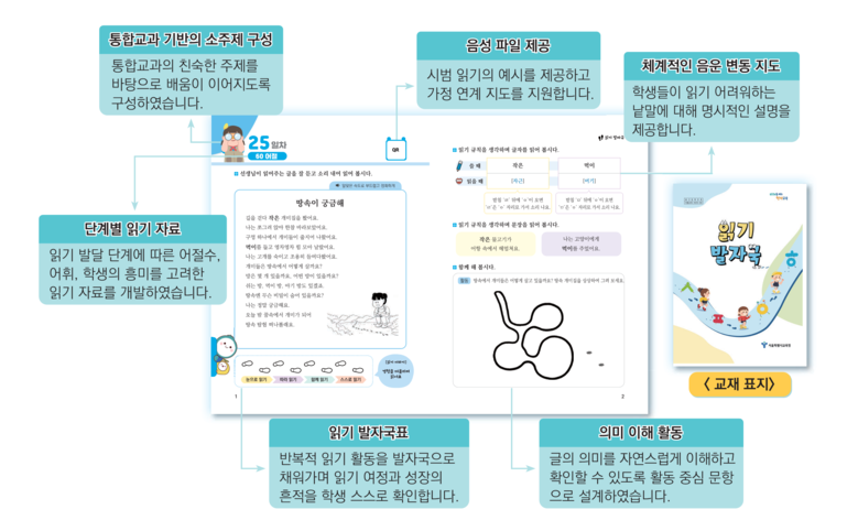『읽기 발자국』은 초등학교 1~2학년 대상으로 개발되어 총 4단계로 제작되었다. 단계별로 어절 수, 어휘 수준, 음운 규칙 등을 체계적으로 조정하여 학생들이 점진적으로 읽기 능력을 확장할 수 있도록 구성되었다. 또한, 시범 읽기 음성 자료를 제공하여 교실 뿐만 아니라 가정 연계 지도를 지원한다.