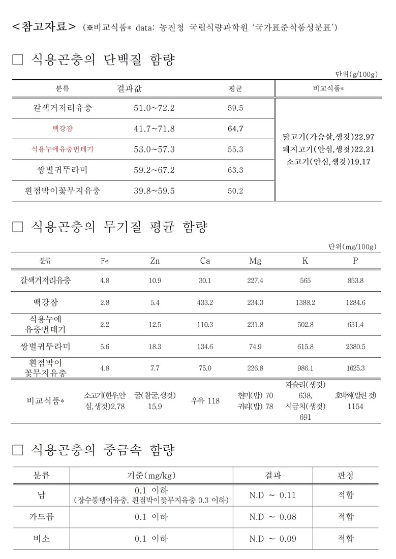 분석 결과, 식용곤충의 단백질 함량은 100g당 평균 39.8~72.2g 범위로 나타나 일반 육류(닭고기·돼지고기·소고기 19~23g)의 두 배 이상 수준이었다. 곤충별 평균 단백질 함량은 백강잠이 64.7g, 쌍별귀뚜라미가 63.3g으로 특히 높았다.