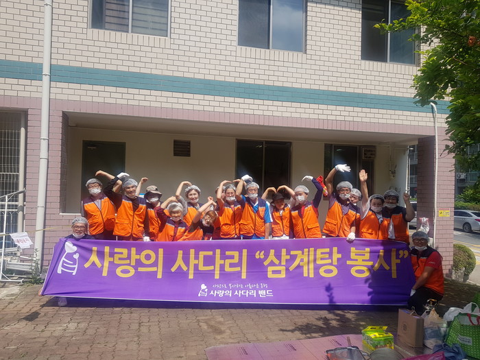 송강그린아파트 입주자대표 김희재 회장은 “오늘 사랑의 사다리 밴드 봉사단체에서 삼계탕과 닭죽을 지원해주셔서 큰 힘과 위안이 된다.“면서 감사함을 전했다.