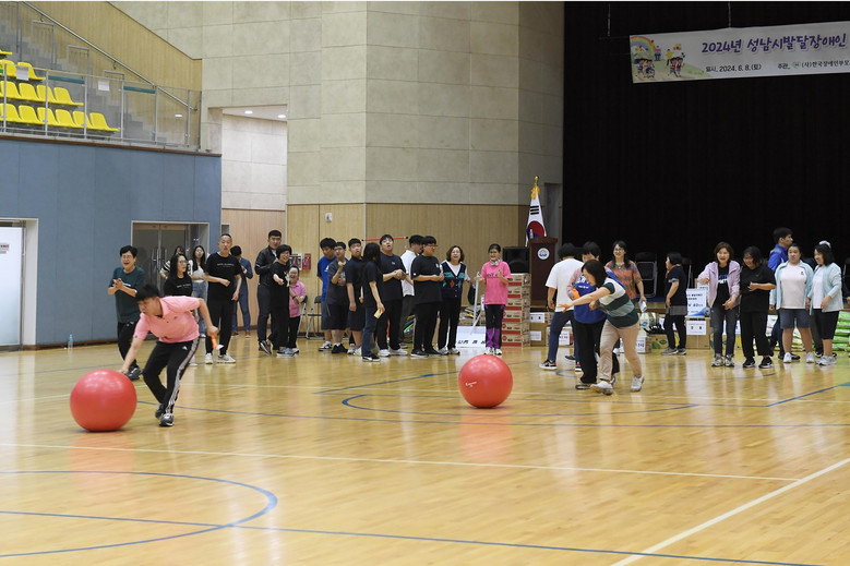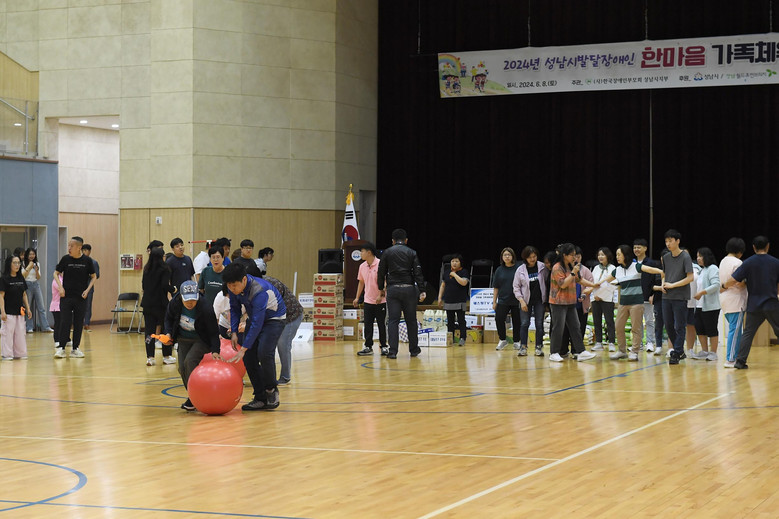 | ▲ 지난해 6월 성남종합스포츠센터에서 열린 성남시 발달장애인 한마음 가족 체육대회 때 짐볼 굴리기 경기 |