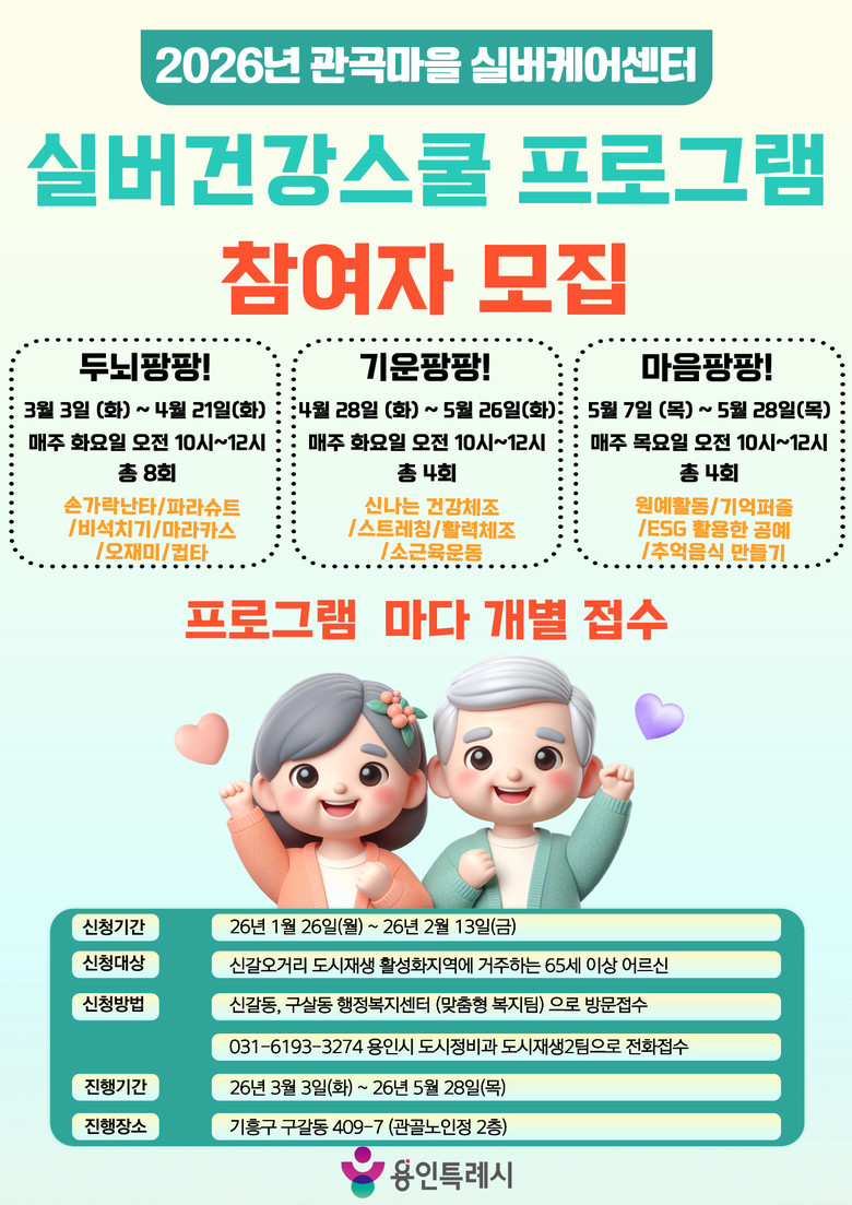 프로그램은 신갈오거리지역 도시재생활성화사업 일환으로 리모델링한 관곡마을 실버케어센터(기흥구 신구로22번길 7-24)에서 진행한다.