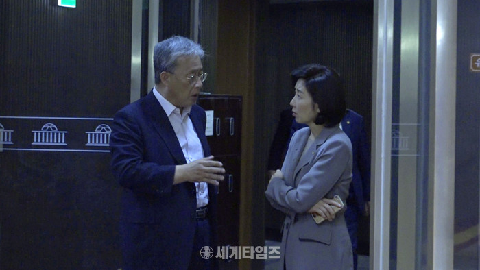 | ▲ 26일 국회본회의장 입구에서 자유한국당 나경원 원내대표와 대안정치연대 유성엽 대표가 의견을 나누고 있다. |