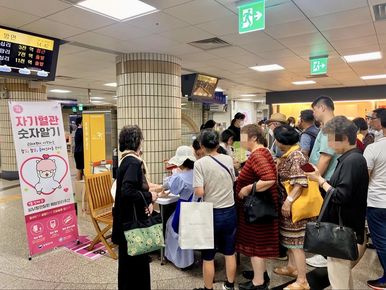 | ▲ 성남시 보건소 직원들이 지난해 9월 분당구 야탑역사에서 시민 대상 혈압 측정과 건강 상담을 하고 있다(자료사진) |