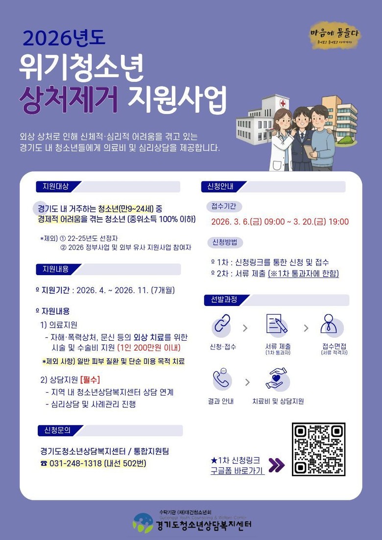 - 지역 청소년상담복지센터 연계를 통한 심리상담 및 일상 회복 지원 [경기도 세계타임즈=송민수 기자] 경기도가 자해 상처, 폭력 피해 문신 등으로 신체적·심리적 어려움을 겪는 청소년을 돕기 위해 오는 20일까지 ‘위기청소년 상처제거 지원사업’의 상반기 신청자를 접수한다.