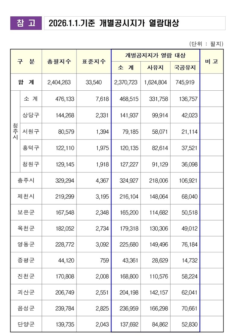 김승래 충북도 토지정보과장은 “개별공시지가에 대해 도민과 소통하고 궁금증 해소를 위해 감정평가사 상담제를 운영하고 있으니 언제든 자유롭게 의견을 제출해 달라”고 당부했다.