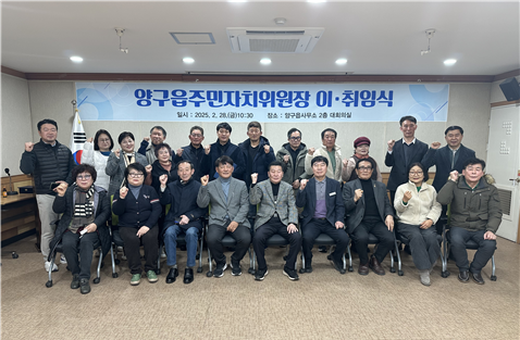 [양구군 세계타임즈=김민석 기자] 양구읍주민자치위원회는 지난 2월 28일 양구읍주민자치위원 등 관계자 20여 명이 참석한 가운데 고익수 신임 위원장과 장재순 전임 위원장의 이·취임식을 개최했다.