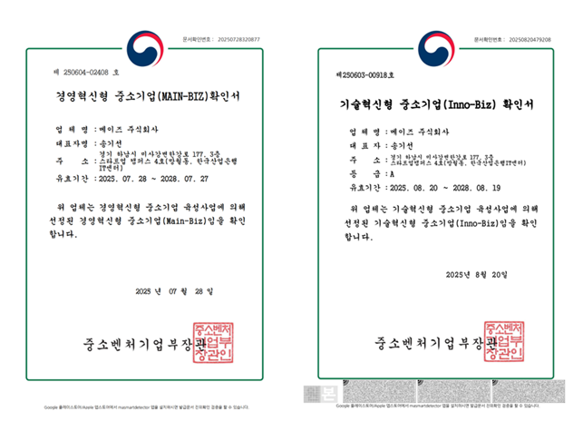 이번에 메이즈가 획득한 메인비즈 인증은 기업의 재무 건전성, 조직 관리, 인적자원 관리, 경영자의 리더십 등 경영 혁신 전반을 평가하는 제도로, 우수한 경영 시스템을 보유한 기업에게 주어진다. 또한 이노비즈 인증은 기술혁신 성과, 기술사업화 역량 등을 종합적으로 검증해 부여되는 국가 인증으로, 기술 경쟁력을 갖춘 기업만이 받을 수 있다.