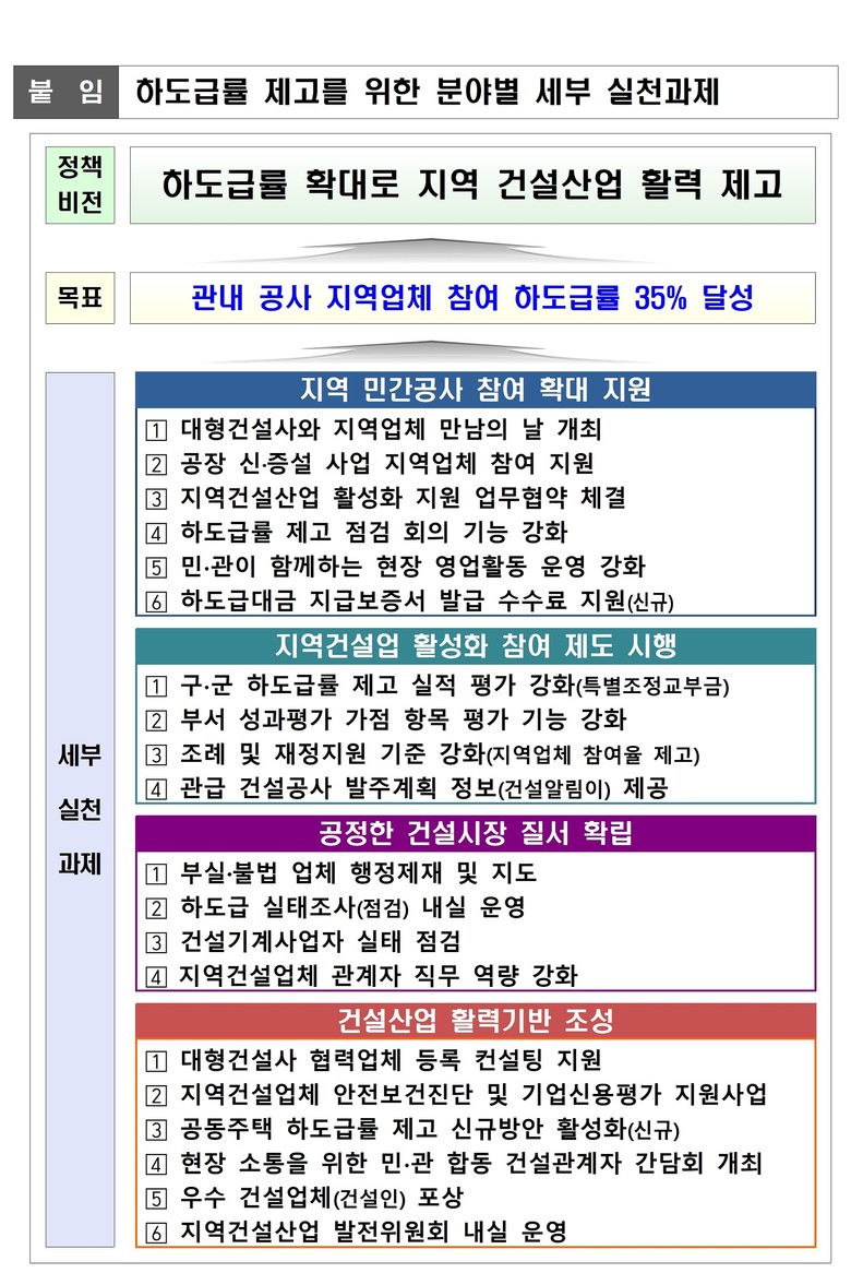 이 계획은 지역건설산업 하도급 확대를 통한 지역 건설산업에 활력 제고를 위해 지역건설산업 하도급률을 2024년 33.08%(전체 4조 5,769억원 중 지역 1조 5,139억 원) 대비 2%p 상향한 35%를 목표로 한다.