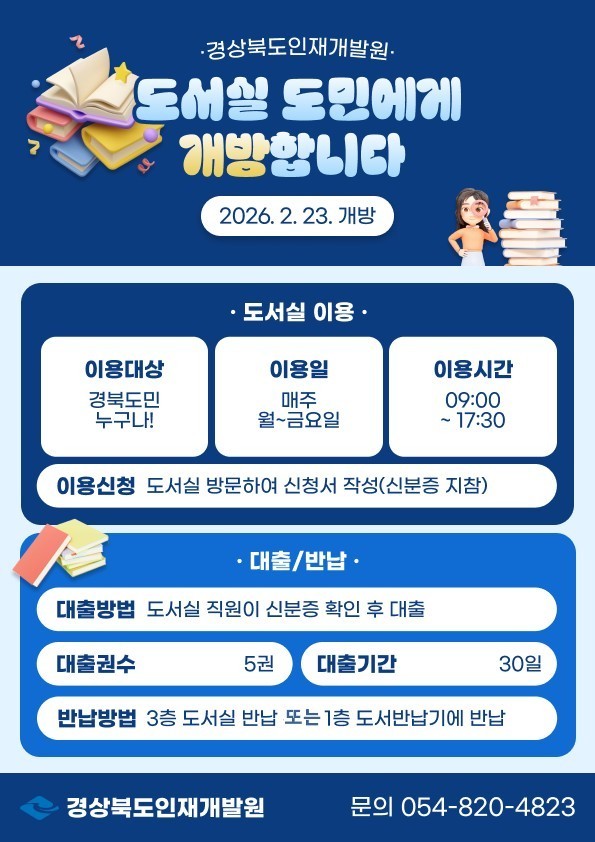 - 경북도민이면 누구나, 1인 최대 5권, 30일간 대출 - [경북 세계타임즈=한윤석 기자] 경상북도인재개발원(원장 우광진)은 신청사 이전을 계기로 지역사회와 상생하는 공공 교육기관으로서의 역할을 강화하고자, 오는 2026년 2월 23일부터 도서실을 지역주민에게 개방한다.