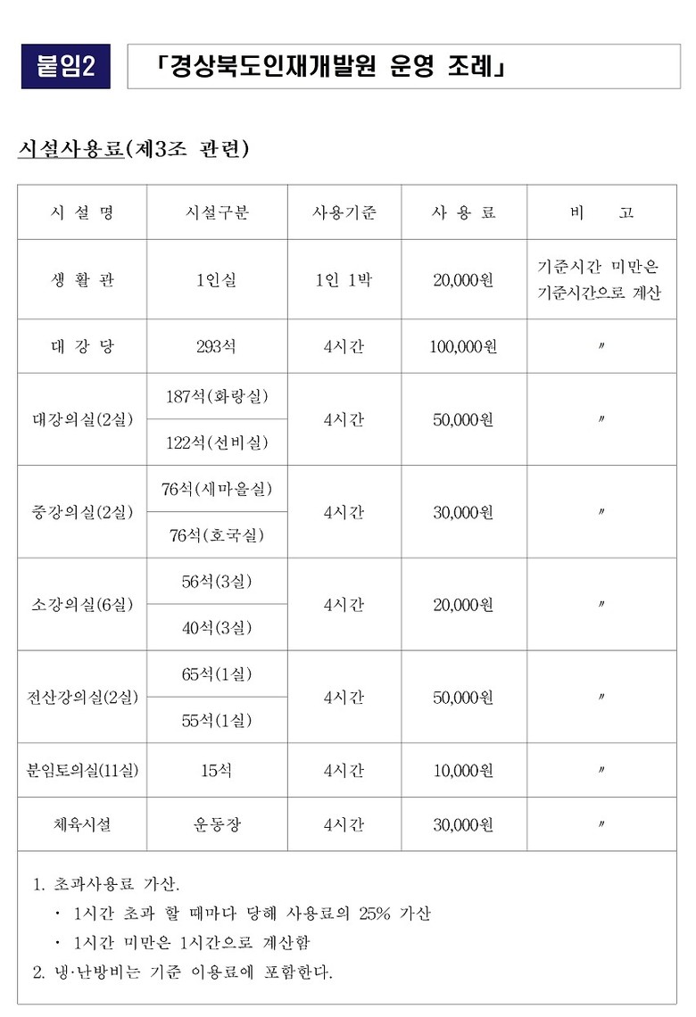 또한, 인재개발원은 청사 시설을 일반에 개방하여 운영 중이다. 강의실 및 분임토의실 등 청사 시설에 대해 대관 신청을 받아, 사용허가 요건을 충족하는 공익 목적의 행사・교육 등에 사용할 수 있도록 하여 도민과 함께하고 지역과 상생하는 사회적 가치를 실현하고 있다.