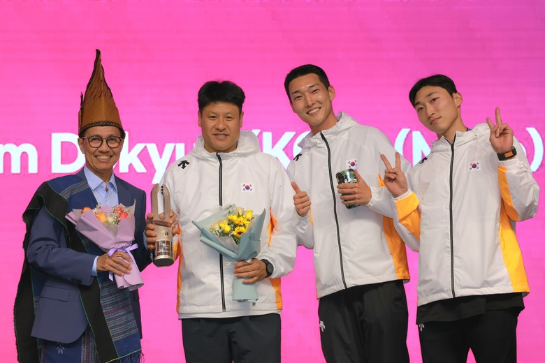 | ▲ 용인특례시 직장운동경기부 육상팀 우상혁(오른쪽 두번째), 유규민(오른쪽 첫번째) 선수와 김도균(왼쪽 두번째)감독이 2025 구미 아시아육상경기 선수권대회에서 메달을 획득하고 기념촬영하고 있다 |