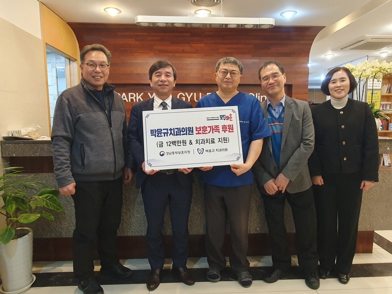 박윤규 원장은 기부금 1,200만원을 기탁하였으며, 해당 기부금은 사회복지공동모금회를 통해 생계가 곤란한 보훈가족에게 지원될 예정이다. 또한 기부금과 별개로 분기별로 4명씩 총 16명에게 임플란트, 틀니 등 6,400만원 상당의 치과치료도 지원하고 있다.