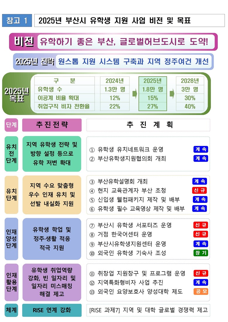 시는 '유학하기 좋은 도시 부산, 글로벌 허브도시로 도약'이라는 비전 아래, 올해(2025년) 전략을 '원스톱 지원 시스템 구축과 지역 정주여건 개선'으로 정하고, 4단계 추진전략(▲유학생 유치 전 단계 ▲유치단계 ▲인재 양성 단계 ▲인재 활용 단계 등 단계별 전략), 13개 추진계획을 수립했다.