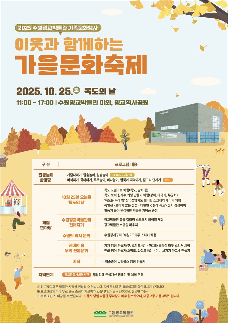 자세한 내용은 수원광교박물관 공식 홈페이지와 SNS에서 확인할 수 있으며, 일부 체험은 소정의 재료비가 있다.