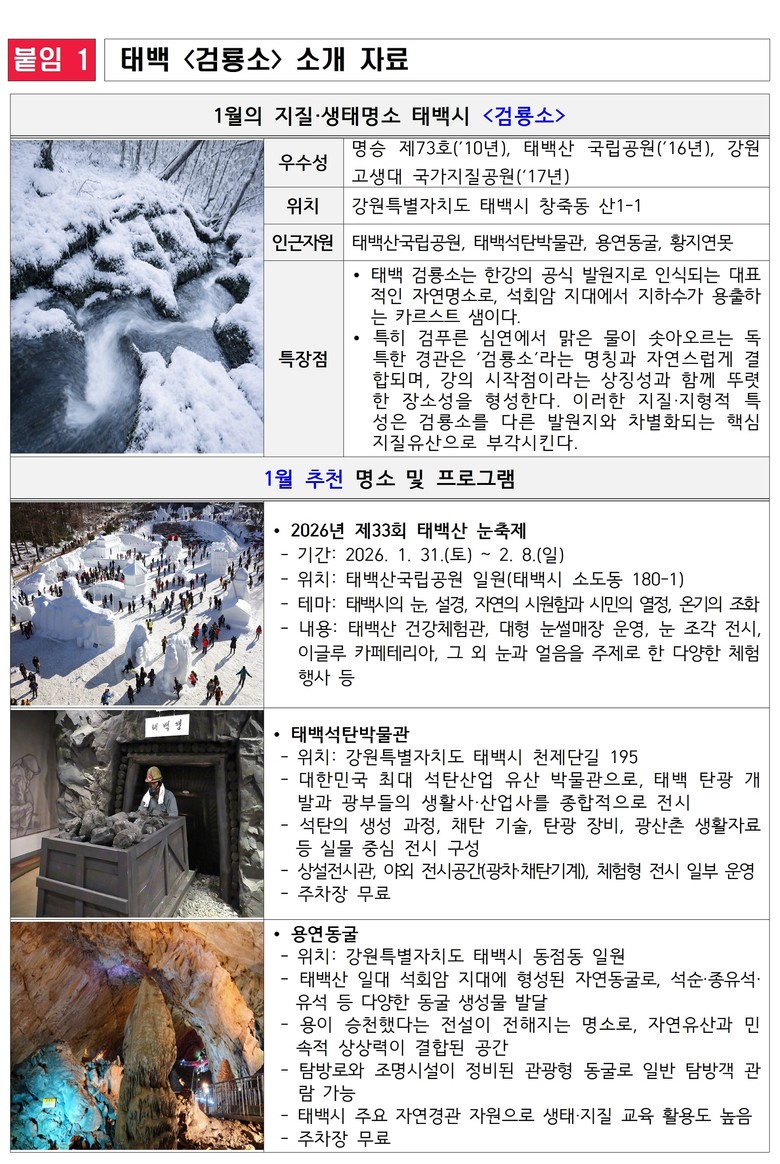 또한 1월 31일부터 태백산국립공원 일원에서 열리는 ‘제33회 태백산 눈축제’와 연계해, 겨울철 태백을 찾는 관광객들에게 자연·문화 체험의 폭을 넓혀줄 것으로 기대된다.