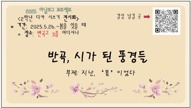 ‘지난, 봄이었다’라는 부제로 진행되는 전시는 2학년 학생들이 생활하는 3층 복도를 중심으로 ▲복도 창가 ▲도서관 앞 게시판 ▲계단 방화문 벽 등 교내 곳곳에 설치돼, 학생들이 일상에서 자연스럽게 작품을 감상할 수 있도록 구성됐다.