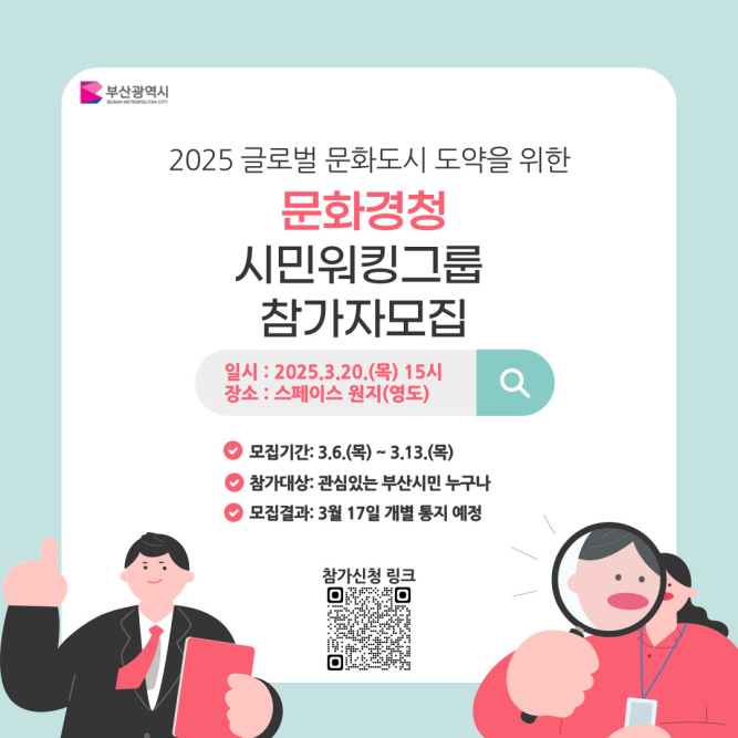 문화경청을 위한 첫 발걸음인 '시민 실무단(워킹그룹) 부산문화동행'은 3월 20일 첫 회의(킥오프 회의)로 그 시작을 알린다. 회의는 3월 20일 스페이스 원지(영도구 소재)에서 열리며, 내일(6일)부터 3월 13일까지 시민 실무단을 모집한다. 관심 있는 시민 50명을 모집해 진행되는 방식으로 민간의 생생한 의견을 적극 반영, 기존의 문화 정책에 혁신적 변화를 시도할 계획이다.