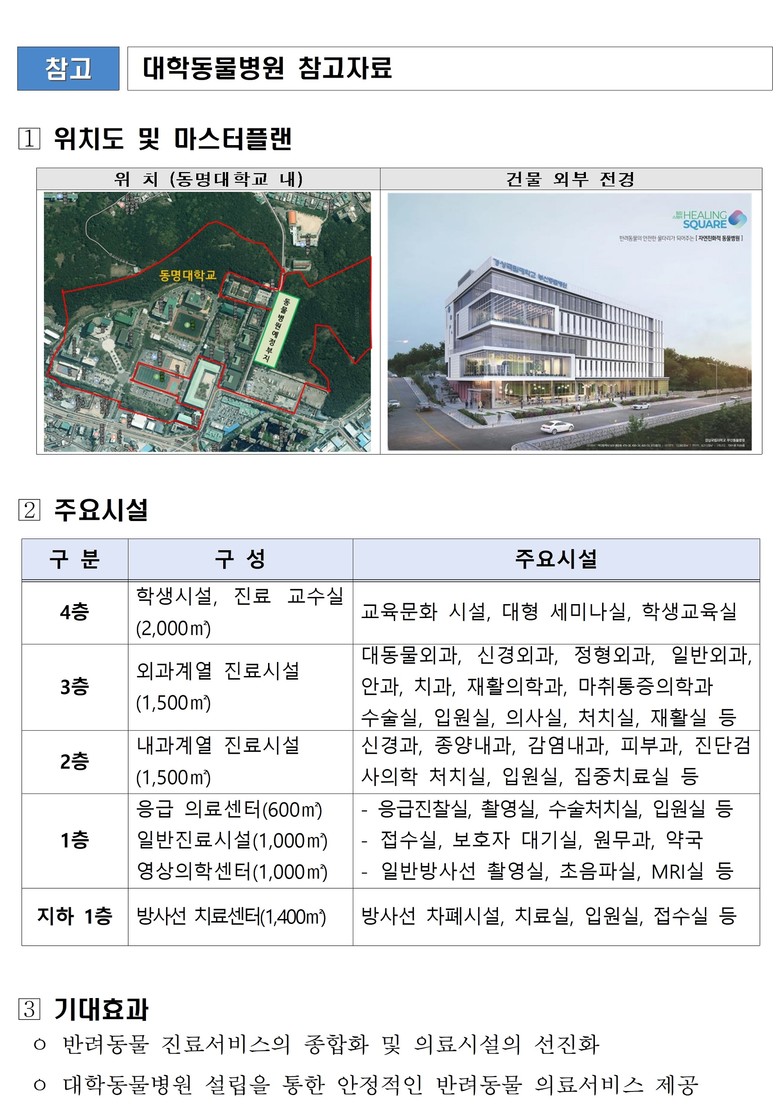 ◈ 건립 규모는 부지 1만3천300제곱미터(㎡), 연면적 9천213제곱미터(㎡)(지하1층·지상4층)로, 서울대학교 수의과대학 동물병원의 1.6배 크기… 전국에서 가장 큰 규모