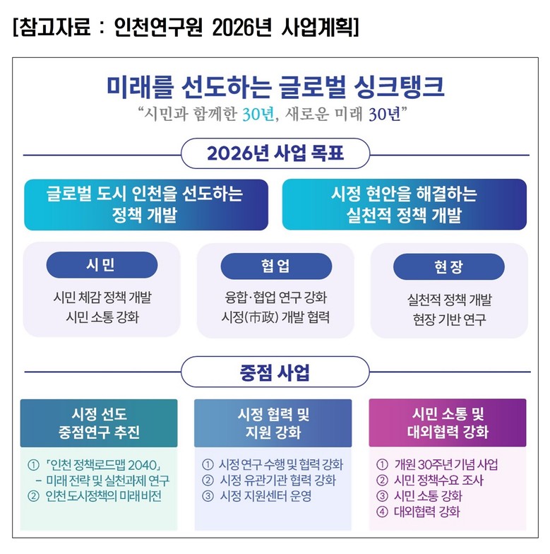 개원 30주년을 맞이한 인천연구원은 2026년을 지난 30년간의 연구성과를 토대로 새로운 미래 30년을 준비하는 전환의 해로 설정했다. 이에 따라 2026년 사업 목표를 “글로벌 도시 인천을 선도하고, 시정 현안을 해결하는 실천적 정책 개발”로 정하고, ▲미래 아젠다 발굴 및 시정 선도 연구 강화, ▲시정 협력 및 지원 기능 고도화, ▲시민 소통과 대외협력 강화 등을 중점적으로 추진할 계획이다.