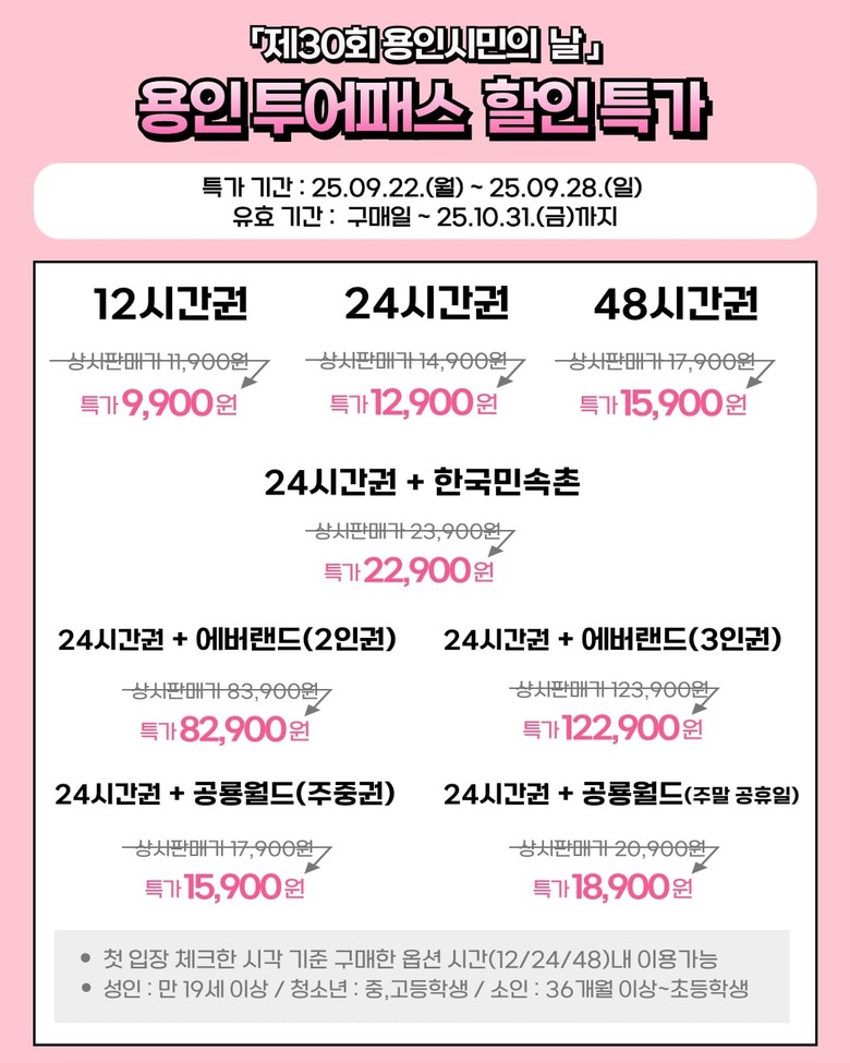 용인투어패스는 22일부터 28일까지 7일간 할인 판매된다. 기본권은 2000원, 패키지권은 1000원이 각각 할인되며, 구매는 용인관광 홈페이지와 공식 SNS에서 안내되는 링크를 통해 가능하다.