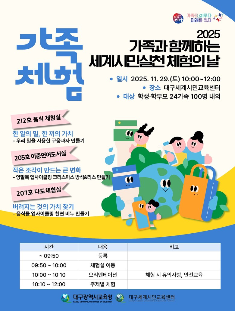 [대구 세계타임즈=한윤석 기자] 대구시교육청은 11월 29일(토) 대구세계시민교육센터에서 사전 신청을 통해 모집된 24가족을 대상으로 ‘가족과 함께하는 세계시민실천 체험의 날’을 운영한다.