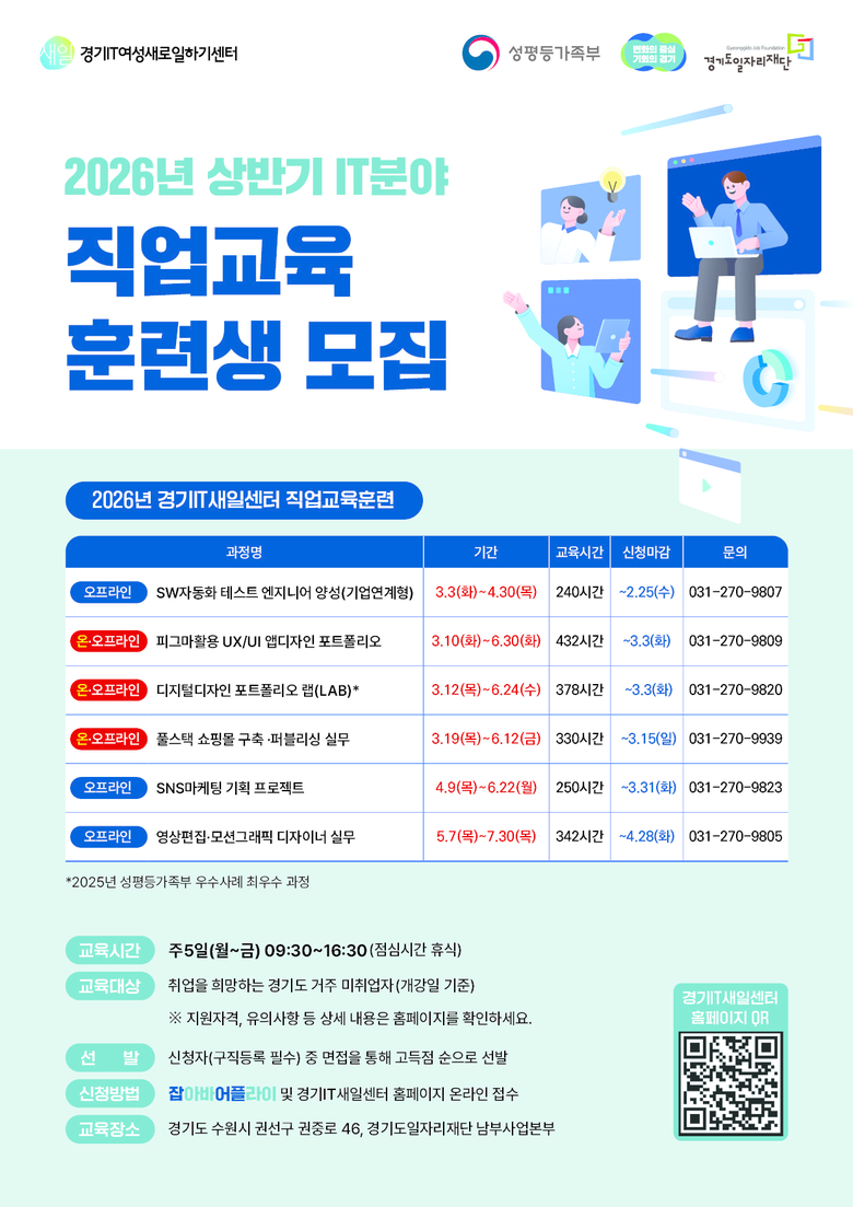 교육 신청은 경기IT새일센터 누리집(itsaeil.or.kr) 또는 잡아바 어플라이(apply.jobaba.net)에서 가능하다. 문의는 경기도일자리재단 남부일자리팀(031-270-9800)으로 하면 된다.