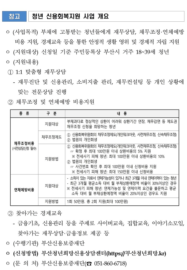 ◈ 주민등록상 부산 거주 18~39세 청년을 대상으로 전문 재무 상담사가 일대일(1:1) 맞춤형 재무 상담, 채무조정 및 연체 예방 비용지원, 찾아가는 경제교육 등 실시해