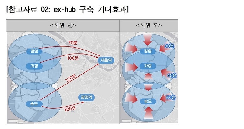 교통수요 예측 결과, 송도국제교와 검암역이 유력한 ex-HUB 후보지로 도출됐으며, 구축 시 검암은 약 30분, 가정은 40분, 송도는 50분 이내에 광역 고속교통망 진입이 가능해지는 것으로 나타났다. 이는 기존 대비 40~70분의 이동시간 단축 효과에 해당한다.