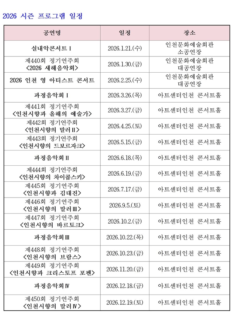 다양한 기획연주회도 공개된다. 8대의 첼로가 만들어내는 묵직하고 중후한 소리를 즐기는 〈실내악 콘서트Ⅰ〉(1월), 오디션을 통해 최종 선발된 바이올린 신승경, 더블베이스 김예은, 오보에 김다인이 인천의 젊은 음악가로서의 가능성과 역량을 펼쳐 보일〈2026 인천 영 아티스트 콘서트〉(2월)가 기다리고 있다.