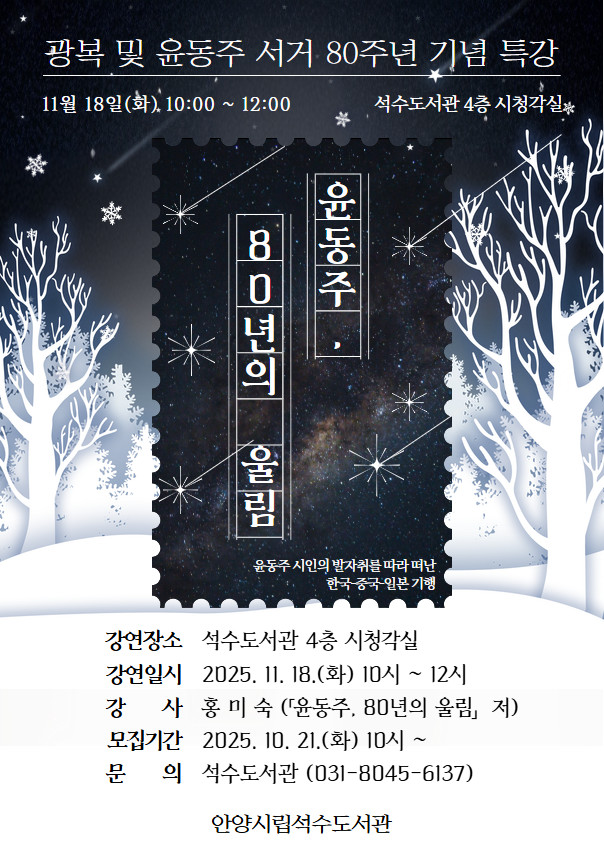 석수도서관 관계자는 “이번 광복 80주년 기념 특강 ‘윤동주, 80년의 울림’을 통해 시민들이 광복의 역사적 의미를 되새기고, 윤동주 시인의 작품 속 문학적인 맥락을 더욱 깊이 이해하는 시간이 되었으면 좋겠다”고 밝혔다.