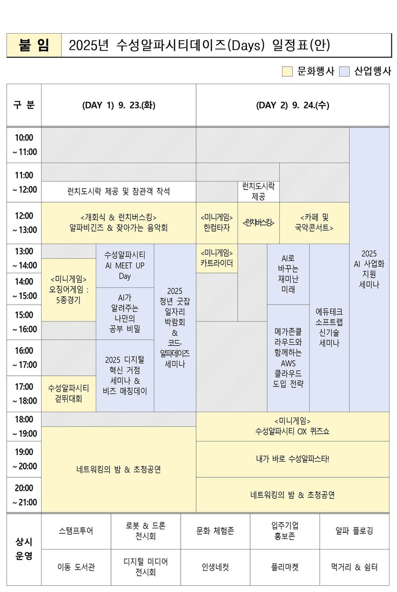 행사 일정과 세부 프로그램은 ‘2025 수성알파시티데이즈’ 공식 홈페이지(www.alphacitydays.co.kr)에서 확인할 수 있으며, 일부 인원 제한이 있는 프로그램은 9월 22일(월)까지 참가 신청을 받는다.