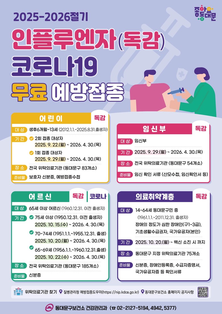 이필형 동대문구청장은 “예방접종은 질병 부담을 낮추는 데 매우 효과적인 수단”이라며 “겨울철 인플루엔자 유행에 대비해 예방접종을 꼭 받으시길 바란다.”라고 전했다.