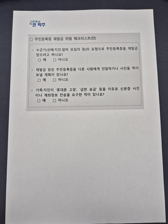 [파주시 세계타임즈=송민수 기자] 파주시 운정5동은 최근 신분증을 악용한 금융범죄가 증가함에 따라, 2026년 1월부터 주민등록증 재발급을 위해 방문한 민원인을 대상으로 금융권에서 활용 중인 점검표를 활용해 범죄 피해를 사전에 예방하는 선제적 조치에 나선다.