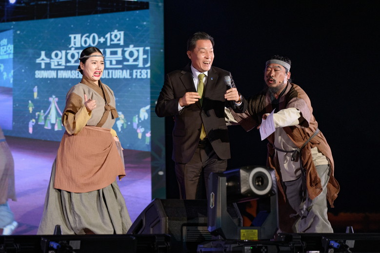 | ▲ 이재준 수원시장(가운데)이 지난해 수원화성문화제 메인공연에서 인사말을 하고 있다. |