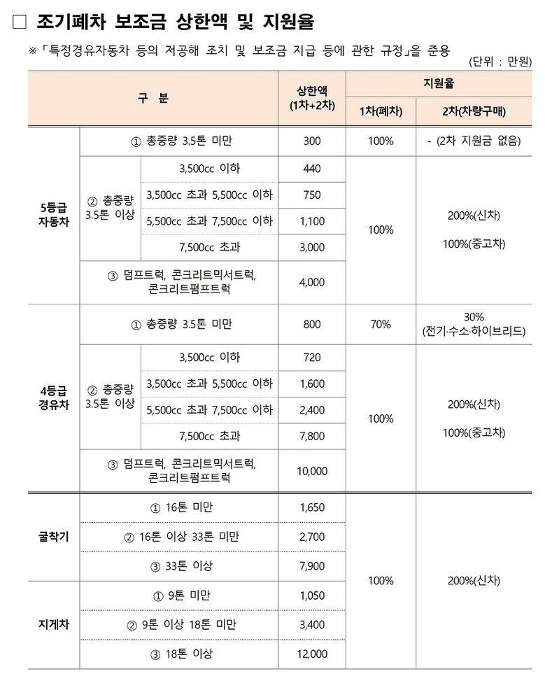 올해부터는 보조금 체계가 일부 변경된다. 4등급 차량(총중량 3.5톤 미만)의 경우 1차 지원율이 기존 50%에서 70%로 상향되고, 친환경차 구매 시 2차 지원금(30%)도 추가로 받을 수 있다. 반면 5등급 차량(3.5톤 미만)은 차량구매에 따른 2차 보조금이 폐지되어 올해부터는 1차 조기폐차 지원금만 받을 수 있다.
