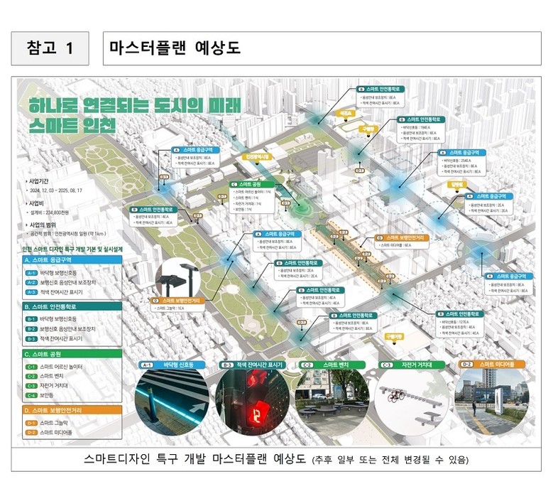 - 스마트 응급구역·안전통학로·스마트 공원·보행안전거리 등 4개 분야…시민 생활 편의와 안전 강화 - [인천 세계타임즈=심하린 기자] 인천광역시(시장 유정복)는 남동구 구월동 일원(인천시청 주변 약 1㎢)에 총사업비 33억 7천만 원(국비 70%, 시비 30%)을 투입해 전국 최초로 ‘스마트디자인 특구’를 조성한다고 밝혔다.