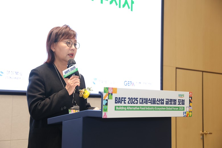- 지속가능한 미래식품 산업 육성...기술혁신과 투자 연계로 산업 성장 견인 - [경북 세계타임즈=송민수 기자] 경상북도는 23일 서울 롯데월드타워 SKY31컨벤션에서 양금희 경상북도 경제부지사, 김주수 의성군수를 비롯한 지자체 및 푸드테크 산업 관계자 등 각계 전문가 200여 명이 참석한 가운데 ‘2025년 대체식품 산업 글로벌 포럼(BAFE*)’을 개최했다.