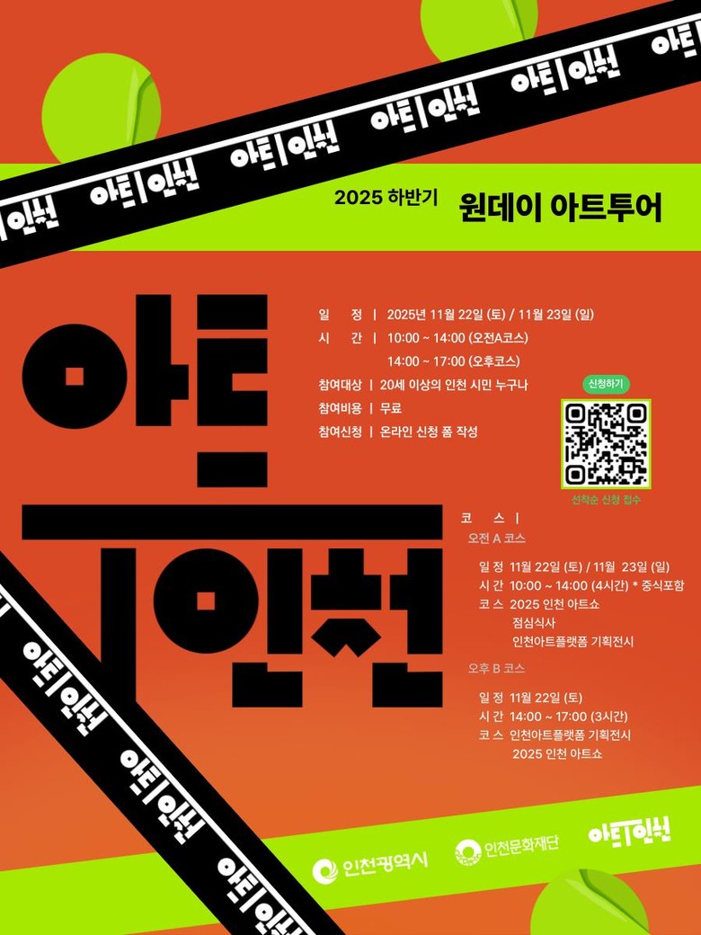 상반기에 이어 하반기에도 진행하는 「아트·T 인천」 원데이 아트투어는 인천아트플랫폼 기획전시와 인천에서 개최되는 아트페어 <2025 인천 아트쇼>로 구성되어 있다. 원데이 아트투어에 참여하는 인천 시민은 준비된 프로그램을 관람하며 동시대 미술의 다양한 흐름과 생생한 현장을 경험할 수 있다.