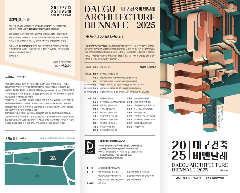 초청전시에서는 ‘2025 대구광역시 건축상’ 수상작, ‘대구건축 아카데미’ 작품, ‘대구건축사회 우수작품’ 등이 소개된다. 젊은 건축가들의 후적지 개발 아이디어도 전시돼 창의적인 도시공간 활용 방안을 제시한다.