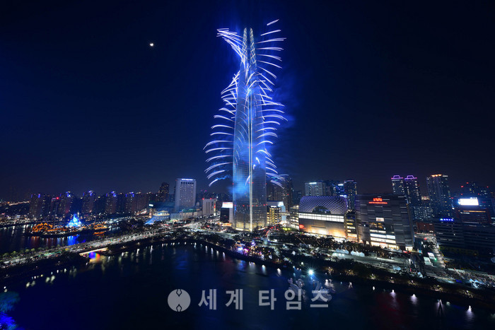 세계에서 5번째로 높은 건물인 롯데월드타워(지하 6층,지상 123층 555m) 개장을 하루 앞둔 2일 오후 서울 송파구 롯데월드타워에서 화려한 불꽃쇼가 펼쳐지고 있다. 이번 롯데월드타워 불꽃축제에는 11분간 3만여 발의 불꽃이 밤하늘을 수놓았으며 40억 여원이 소요됐다. 2017.04.02.(사진=롯데물산 제공)