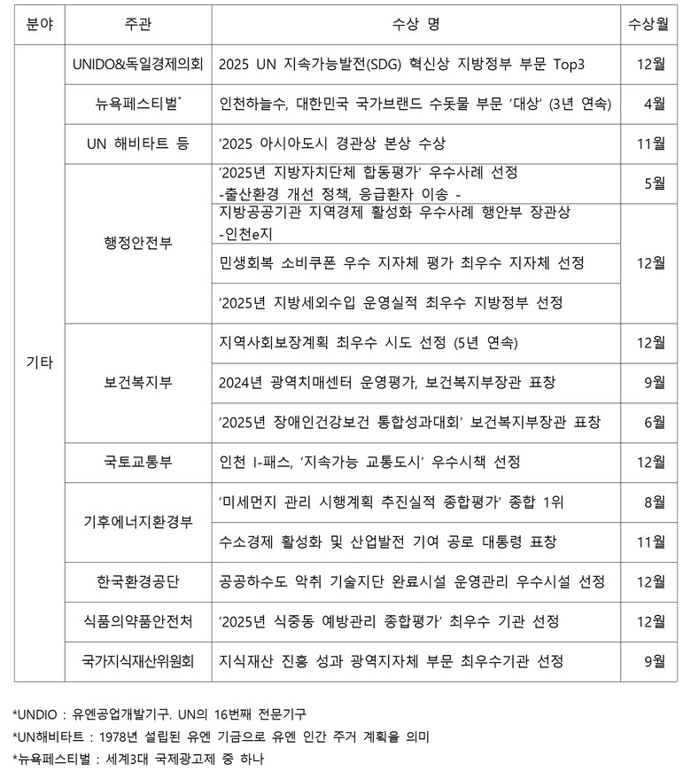 2025년 인천 정책 성과의 정점은 국제 무대였다. 인천시는 국내 최초로 ‘유엔 글로벌 지속가능발전 도시상’을 수상*한 데 이어, UN SDG 혁신상을 2년 연속 수상하며 글로벌 지속가능도시 Top3**에 이름을 올렸다.