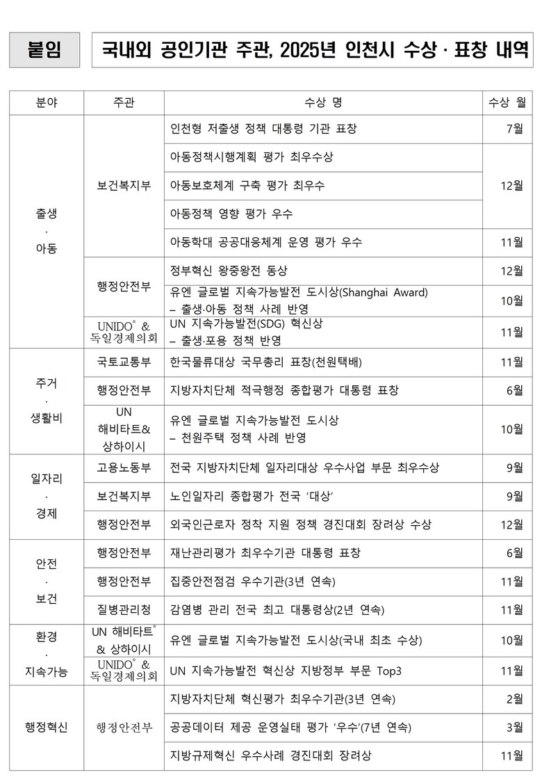 이 같은 성과는 국내 평가에 그치지 않았다. 인천의 출생·아동 정책은 UN 지속가능발전 도시상(Global Award for Sustainable Development in cities (Shanghai Award))과 SDG(Sustainable Development Goals) 혁신상* 심사 과정에서도 저출생과 불평등에 대응하는 도시 전략 사례로도 소개됐다. 지방정부의 개별 시책이 아니라, 도시 생존 전략의 한 모델로 해석되기 시작한 것이다.