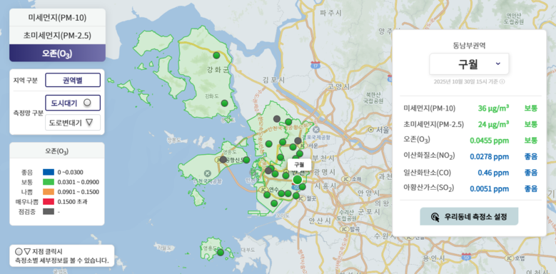 오존주의보는 1시간 평균 농도가 0.12 ppm 이상일 때 발령되며, 인천시는 예·경보권역을 동남부, 서부, 영종·영흥, 강화권역으로 구분해 운영 중이다. 올해 권역별 발령 현황을 보면 동남부 17회, 서부 10회, 영종·영흥 11회, 강화 1회로 집계됐다.