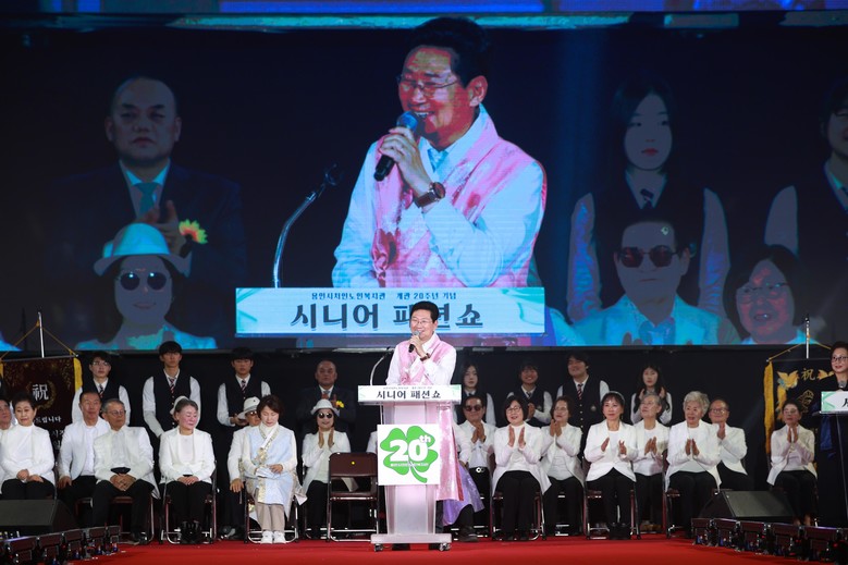 이 시장은 두루마기를 입고 무대에 올라 시니어 모델들과 함께 런웨이를 걸었다.