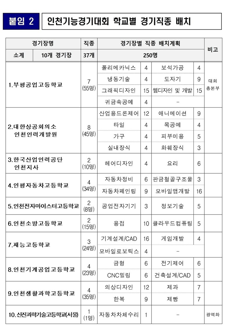 올해 대회에는 지역 내 최고 기량을 갖춘 250명이 37개 직종에 참가하며, 입상자에게는 상장과 메달, 상금이 수여된다. 특히 오는 8월 인천에서 열리는 전국기능경기대회에 인천시 대표 선수로 참가할 수 있는 자격이 주어지는 만큼 선수들의 치열한 경쟁이 예상된다.