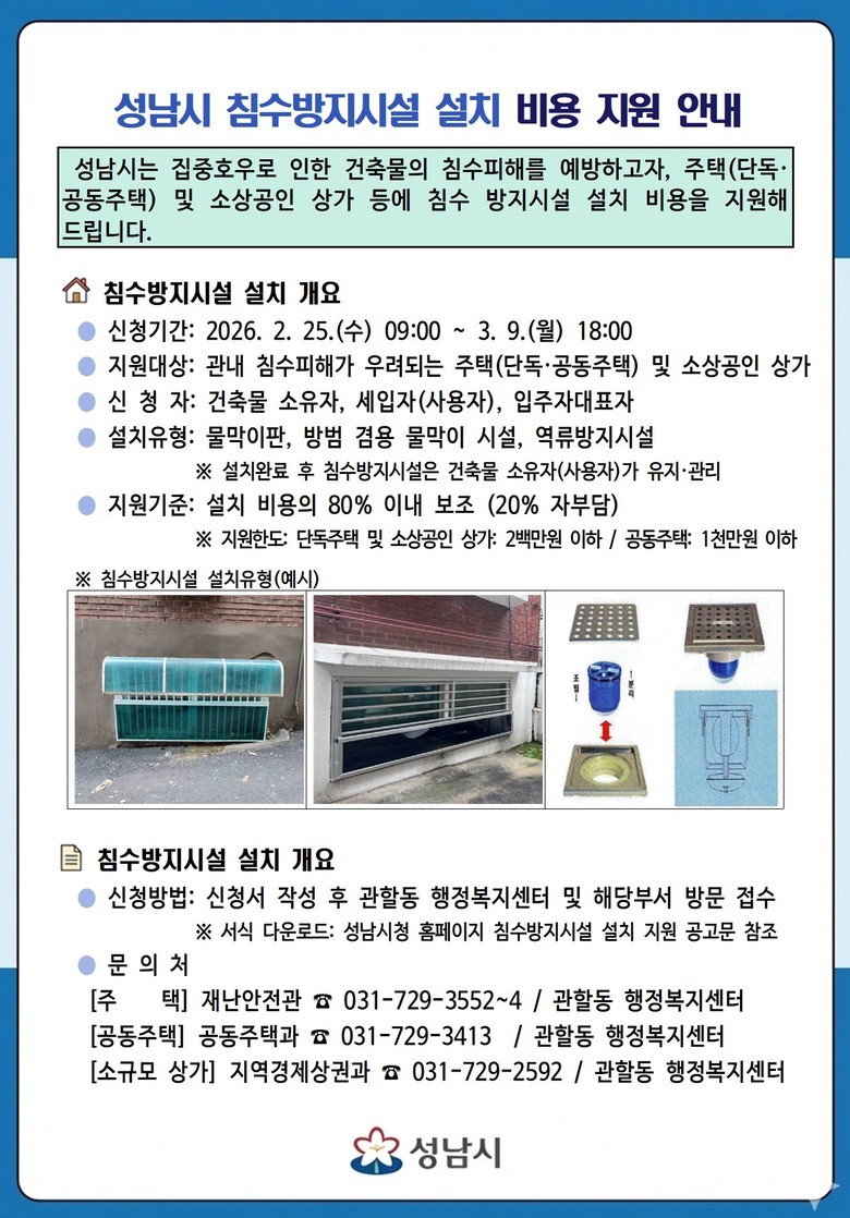 성남시 관계자는 “집중호우로부터 시민의 생명과 재산을 보호하기 위한 사업인 만큼, 침수 피해 예방을 위해 적극적인 신청을 당부드린다”고 말했다.
