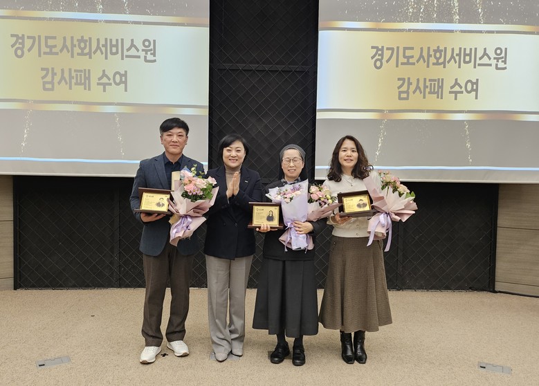 | ▲경기도사회서비스원 안혜영 원장(왼쪽 두 번째)이 경기도사회서비스원 감사패 전달 이후 기념사진을 촬영 중이다.(사진=경기도사회서비스원) |