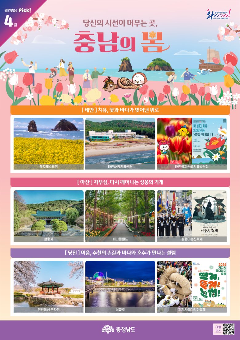 이번 호는 ‘당신의 시선이 머무는 곳, 충남의 봄’을 주제로, 도내 아름다운 봄 풍경과 축제가 어우러진 특별한 여행 일정을 담았다.