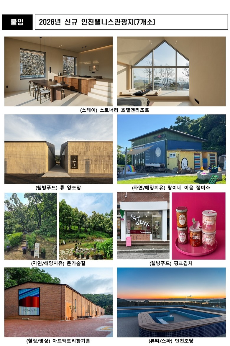 예비 웰니스 관광지로는 고순도 지하 암반 해수 스파 체험이 가능한 △인천조탕(중구)과 지역 특산물인 순무를 활용해 김치를 만들어볼 수 있는 체험형 공간 △핑크김치(강화)가 포함됐다.